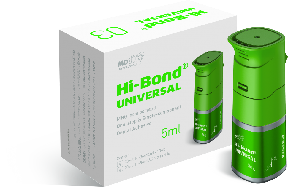 Multi purpose universal adhesive 8th generation bonding system containing 10-MDP and MBG (Mesoporous BioGlass) filler. Hi-Bond™ is a MBG(mesoporous BAG) incorporated one-step dental adhesive. Hi-Bond™ can produce hydroxyapatite by contacting with saliva through BAG. It has sufficient bonding strength, remineralization effect and preventive effect on post-operative sensitivity.